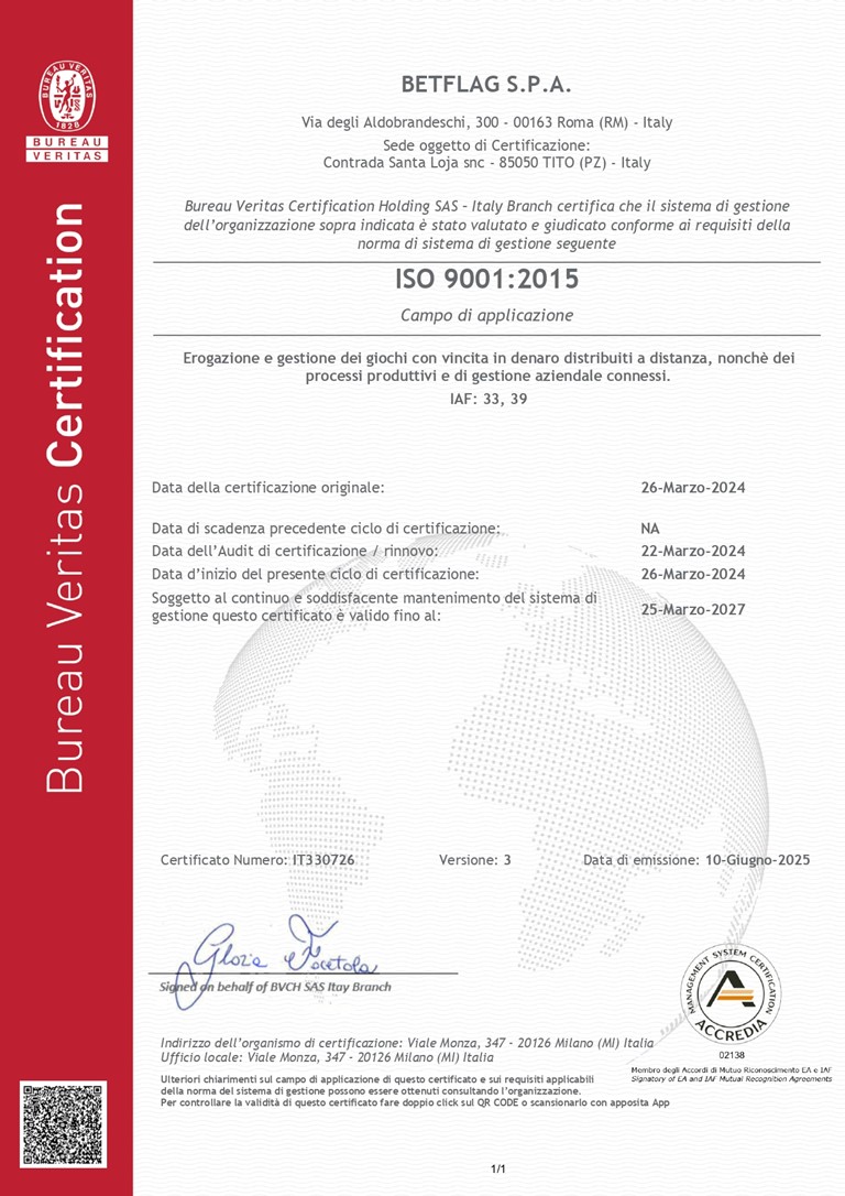 La Certificazione rilasciata da Bureau Veritas certifica che il sistema di gestione dell'organizzazione è stato valutato e giudicato conforme ai requisiti della norma di sistema di gestione ISO 9001:2015.
